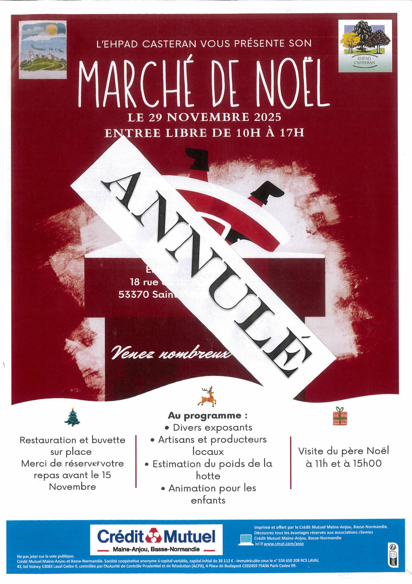 En raison de circonstances logistiques imprévues et indépendantes de notre volonté, le marché de Noël prévu dans notre établissement le 29 novembre 2025 est annulé.
